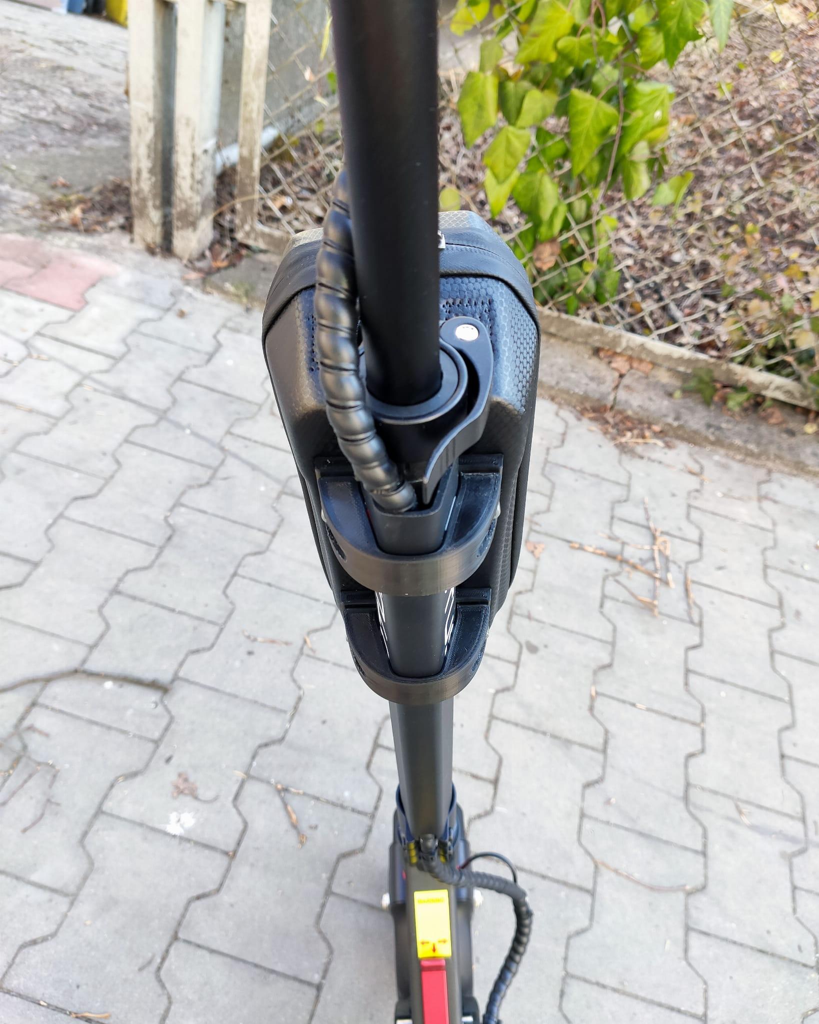 Torba montowana jest na sztycy za pomocą specjalnie zaprojektowanego i idealnie dopasowanego mocowania z druku 3D. Pozwala ono na stabilne i wytrzymałe utwierdzenie torby przy hulajnodze.