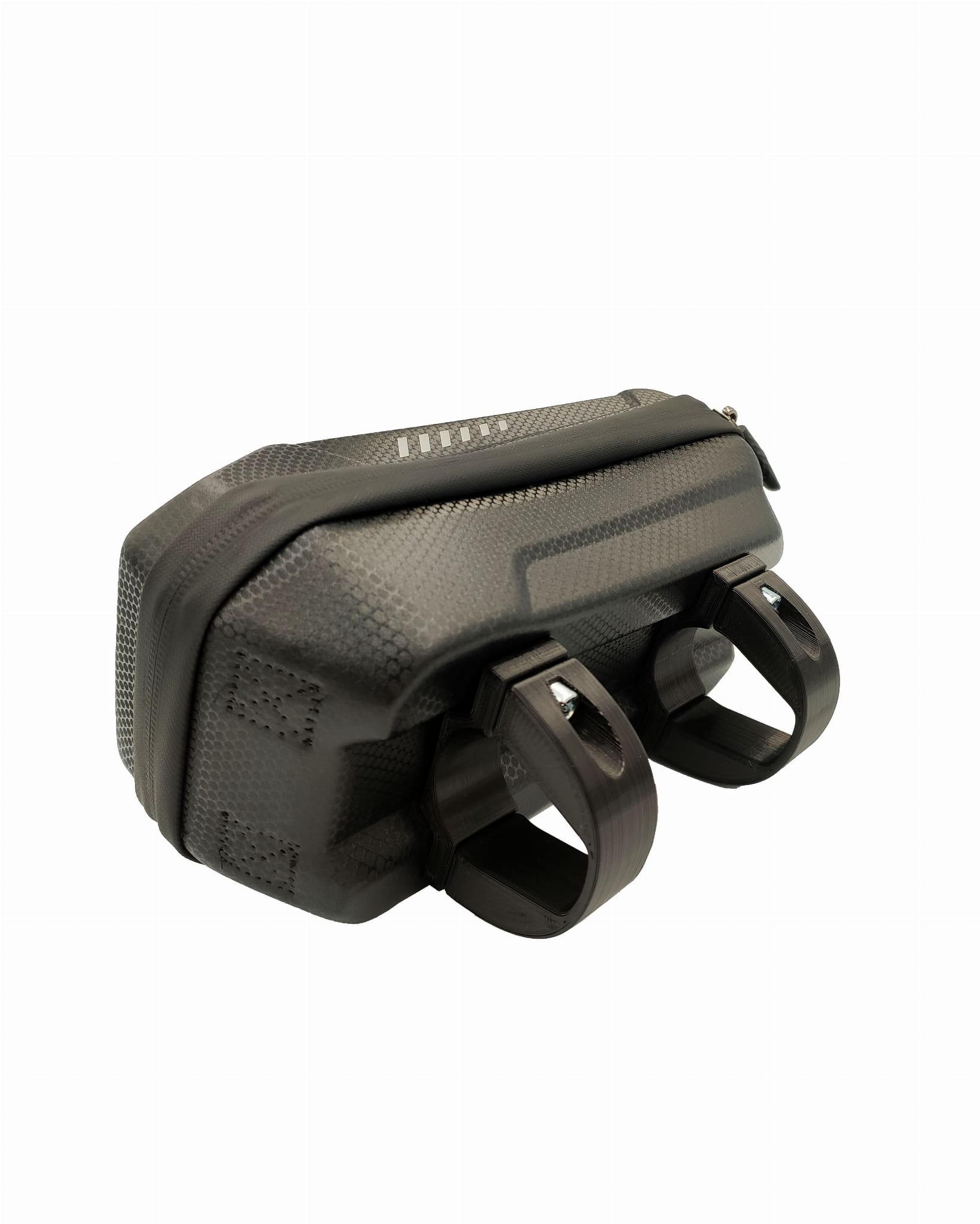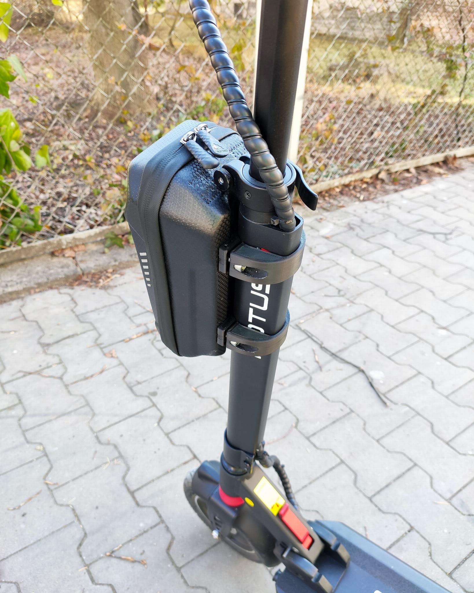 Torba montowana jest na sztycy za pomocą specjalnie zaprojektowanego i idealnie dopasowanego mocowania z druku 3D. Pozwala ono na stabilne i wytrzymałe utwierdzenie torby przy hulajnodze.